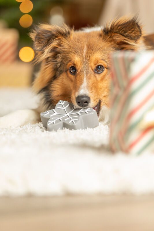 Cette étoile de Noël ne craint ni la pluie ni les « va chercher ! ». Et en plus elle couine. Bref, une étoile tout terrain !